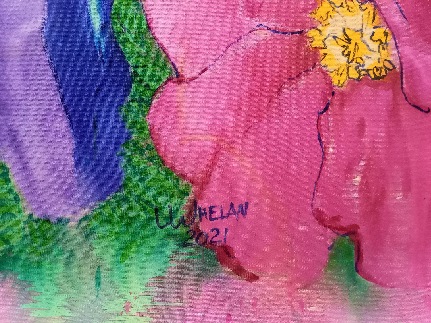 From Aug 14 to Sept 26 an exhibition of recent work by Diana Copperwhite is (or was, depending on when you might be reading this!) at Rathfarnham Castle. After seeing an artist talk (part of a weekly series from Graphic Studio Dublin during lockdown) where Copperwhite presented her art practice, I was curious to see her work in the flesh. As with the other GSD artist talks, recordings can be seen on YouTube (GSD has its own channel); the recording of Diana Copperwhite's presentation can be viewed here. Because of Covid protocols, it is a good idea to ring Rathfarnham Castle in advance to let them know when you wish to see the exhibition. There is easy signage to direct you in viewing the exhibition though there was no one else there when I attended. Although I could see work near the bay windows of the large Dining Room I followed the floor arrow through the door to the long Saloon where most of Copperwhite's work was displayed. Her work draws the viewer in because of its intense colour. I was surprised to find that the large curtain was not a draping painting, but actually an industrial print of a painting onto a large curtain!